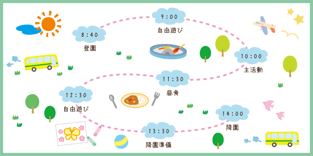 | 保育時間 | 月・火・水(第2、4)・木・金-8時40分~ 14時まで 水(第1、3、5)- 8時40分~11時30分まで |